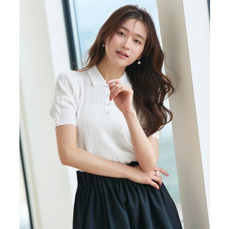 ポロ襟と4つ並んだパールボタンがアクセントに。