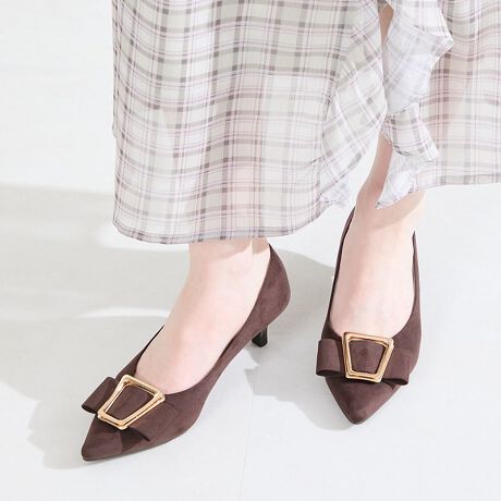 シャープなポインテッドトゥに華奢なヒールが女性らしさを引き立たせてくれるパンプス。大ぶりのモチーフは、クリップ式で付け外しが可能でシーンに合わせての使い分けが可能。つま先や中敷にクッションを入れることでヒールでも歩きやすい設計に。今期はベーシックで万能なブラック、トレンド人気のブラウン、春らしく差し色にもなるくすみグリーンの嬉しい3足展開。【オススメPOINT】●踵クッション入り●厚手クッション入りサンプルにて撮影をしておりますので、中敷色、ロゴ色、裏地の色の仕様に変更がある場合がございます。あらかじめご了承ください。