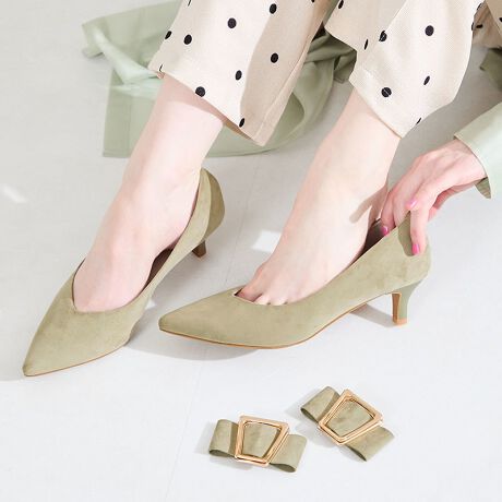 シャープなポインテッドトゥに華奢なヒールが女性らしさを引き立たせてくれるパンプス。大ぶりのモチーフは、クリップ式で付け外しが可能でシーンに合わせての使い分けが可能。つま先や中敷にクッションを入れることでヒールでも歩きやすい設計に。今期はベーシックで万能なブラック、トレンド人気のブラウン、春らしく差し色にもなるくすみグリーンの嬉しい3足展開。【オススメPOINT】●踵クッション入り●厚手クッション入りサンプルにて撮影をしておりますので、中敷色、ロゴ色、裏地の色の仕様に変更がある場合がございます。あらかじめご了承ください。