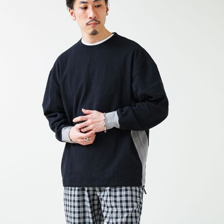 脇〜袖口にかけて配色切替を入れたデザイン。正面はミニマル、横から見た時にアクセントが効くバランス。
