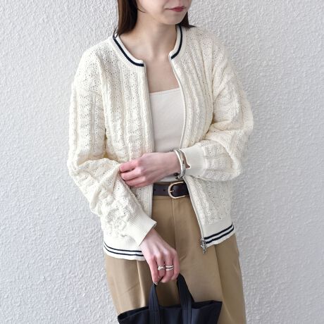 やや透け感のあるレース調の編地が、女性らしさと抜け感を演出してくれるジップカーディガン。