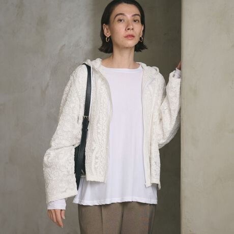甘さとカジュアル感が好バランス。刺繍柄で魅せるフーディトップス。