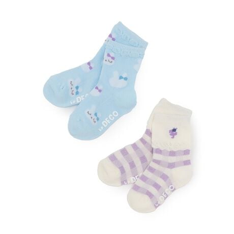 [型番:2161401]mimiちゃんの顔の総柄のソックスと、チェック柄を編み込んだソックスの2足組。気分やコーディネートに合わせて楽しめるリーズナブルなセットです。
