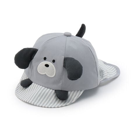 いぬの顔の刺しゅうに、立体的な耳と足のモチーフを付けたキャップ。ストライプのつばと同柄の日除け付きで、日差しケアにも配慮しました。後ろ中心にはロゴ刺しゅうが入り、ドローコードでサイズの微調整が可能。ユーモアのある可愛らしさと実用性を兼ね備えたアイテムです。