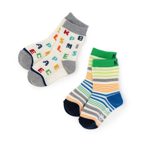 マルチボーダー柄、カラフルなロゴの総柄、気分に合わせて選べる、クルーソックスのうれしい2足組。足元を明るくしてくれる、コーディネートのアクセントにもなるアイテムです。