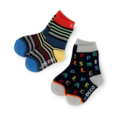 マルチボーダー柄、カラフルなロゴの総柄、気分に合わせて選べる、クルーソックスのうれしい2足組。足元を明るくしてくれる、コーディネートのアクセントにもなるアイテムです。
