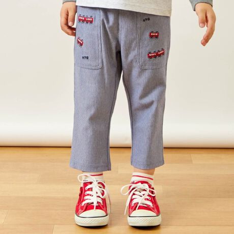 前身の大きなポケットには、配色が目を引く、電車の刺しゅうが入っています。