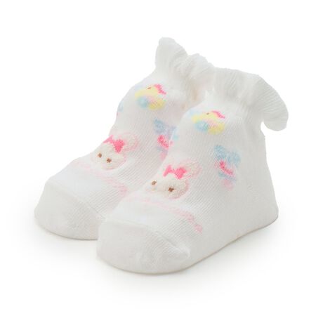 うさぎとやわらかなカラーリングのベビートイをあしらったソックスです。