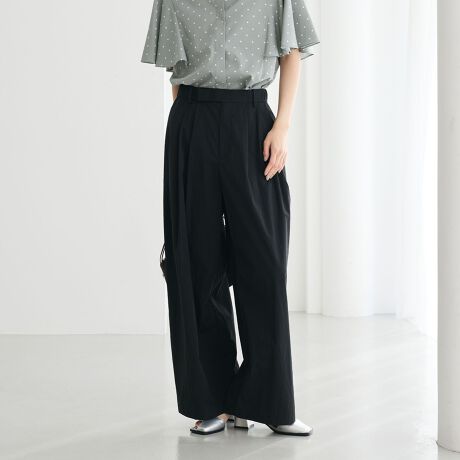 贅沢にフロントタックを3本施したボリューム感に、すっきりとした腰周りのメリハリのあるシルエットがポイント。