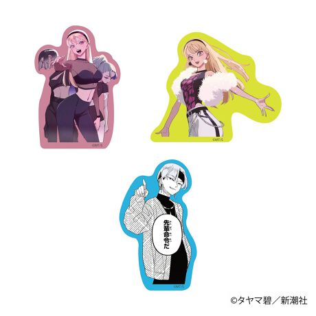 原作のシーンを切り取った百瀬天花とキム・シオンのダイカットステッカー。カラフルな3色の背景とイラストをマッチさせたデザイン。キム・シオンのステッカーはセリフをそのまま残すことでお気に入りのシーンをそのまま持ち運べるようにしました。
