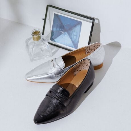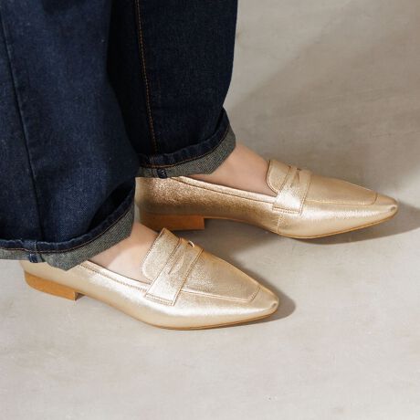 程よく丸みを持たせたポインテッドトゥのフラットローファー。かかとに芯が入っていない為、足当たり柔らかく履ける一足です。