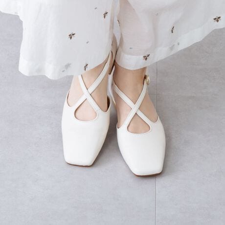 華奢なクロスベルトが甲をしっかりホールドしながら、足元に繊細な美しさを添える一足。幅広なスクエアトゥが足元をすっきりと見せ、カジュアルな日常から、少しフォーマルなシーンまで幅広く活躍します。