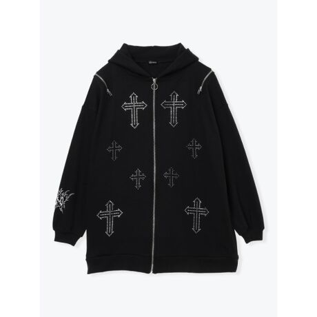 ラインストーンで描かれたクロスモチーフが煌びやかなアクセントになるパーカー。