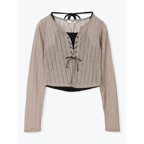 [型番:26560778061]さりげない透け感を楽しめるシアーワイドリブ素材で仕立てられたトップス。フロントはレースアップを施しており、ガーリーなムードを高めています。内側にはキャミソールが付いているので、着こなしに困らないのも魅力的。ミニ丈のボトムスやワイドパンツと合わせたコーディネートがおすすめです。