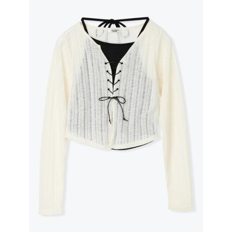 [型番:26560778061]さりげない透け感を楽しめるシアーワイドリブ素材で仕立てられたトップス。フロントはレースアップを施しており、ガーリーなムードを高めています。内側にはキャミソールが付いているので、着こなしに困らないのも魅力的。ミニ丈のボトムスやワイドパンツと合わせたコーディネートがおすすめです。