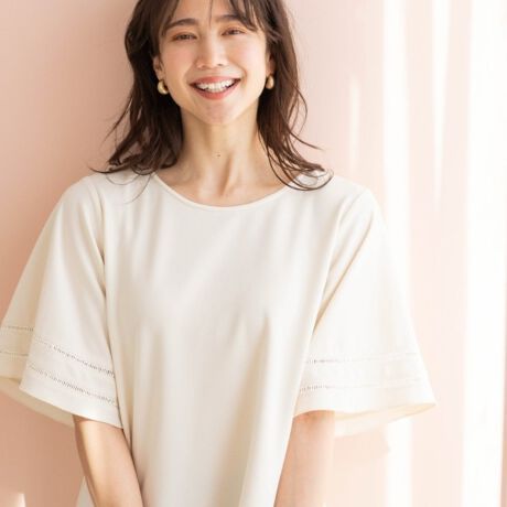 袖口に繊細なハシゴーレス切り替えを施した5部袖トップス。