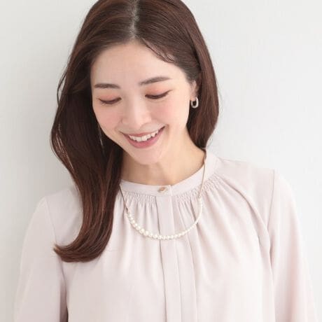 片側に並んだフェイクパールが顔まわりに柔らかなフェミニンさをプラスし、スライドで長さ調整できるノットが縦ラインを自在に演出します。