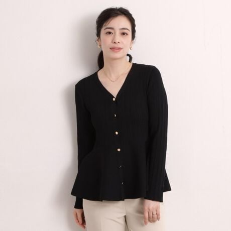 上身部分はリブ編みにすることで縦のラインを強調しすっきり見えに。