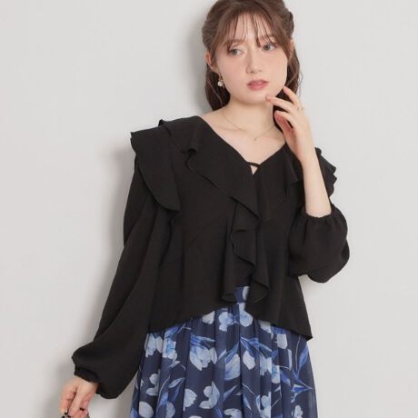 立体的なフリルが顔周りを華やかな印象にしてくれるラッフルブラウス。