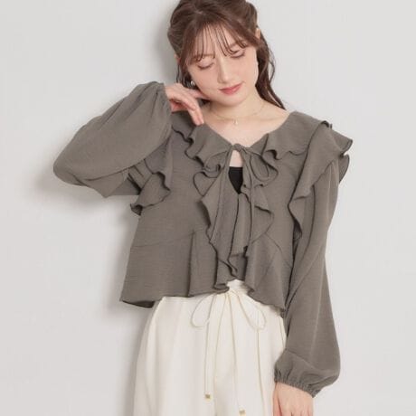 立体的なフリルが顔周りを華やかな印象にしてくれるラッフルブラウス。