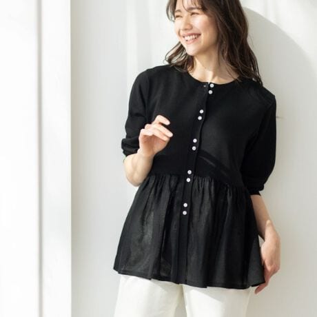 ペプラムデザインがフェミニンな印象の七分袖ニットカーディガン。