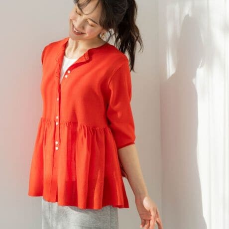 ペプラムデザインがフェミニンな印象の七分袖ニットカーディガン。