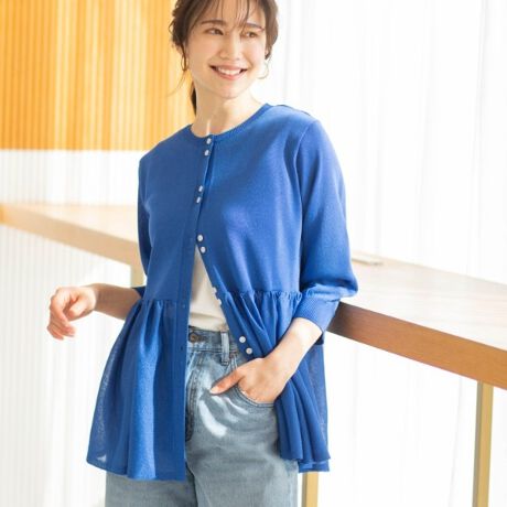 ペプラムデザインがフェミニンな印象の七分袖ニットカーディガン。