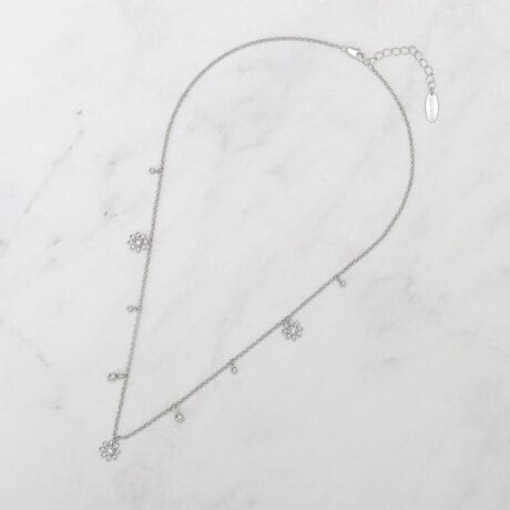 細めのチェーンに、等間隔に配した小粒メタルビーズとフラワーモチーフのチャームがさりげないリズムを生むネックレスです。