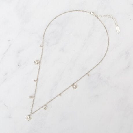 細めのチェーンに、等間隔に配した小粒メタルビーズとフラワーモチーフのチャームがさりげないリズムを生むネックレスです。