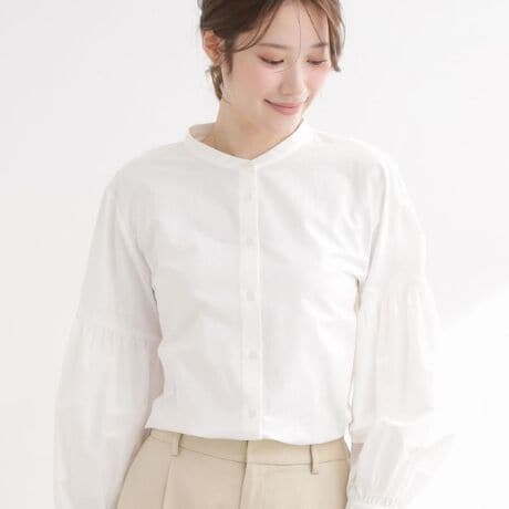 きりっと辛口な印象のシャツながら、袖にボリュームをもたせた女性らしさも併せ持ったシャツ。