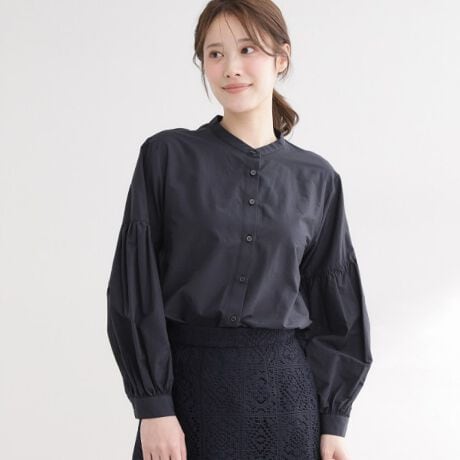 きりっと辛口な印象のシャツながら、袖にボリュームをもたせた女性らしさも併せ持ったシャツ。
