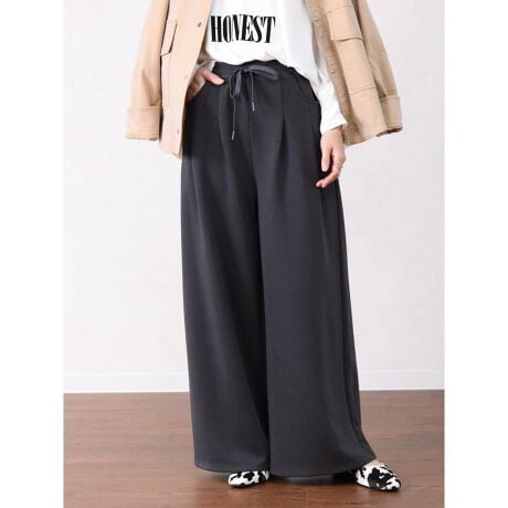 ワイドなストレートシルエットが脚のラインを拾わず、すっきりときれいな印象に。