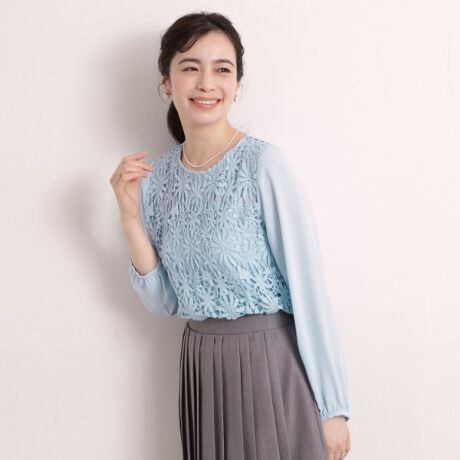 存在感のある大きめの花柄レースがジャケットINでも映える、オフィスシーンにお勧めの一着。
