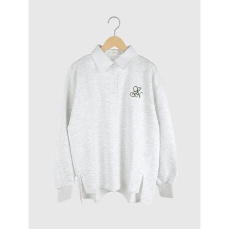 襟元が顔周りをすっきりと見せ、胸元の刺繍ロゴがカジュアルになり過ぎず、女性らしい印象を演出。
