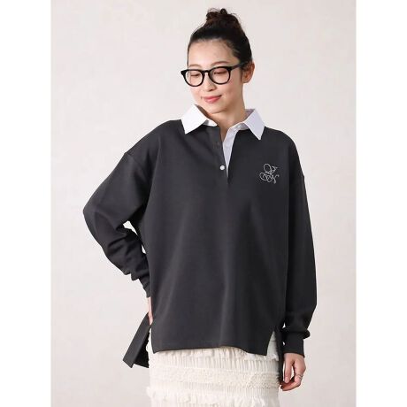 襟元が顔周りをすっきりと見せ、胸元の刺繍ロゴがカジュアルになり過ぎず、女性らしい印象を演出。