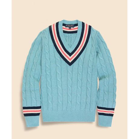 現代ではトラッドアイテムとして不動の地位を確立しているテニスセーター(チルデンセーター)を意外性のあるカラーでアップデートしました。鮮やかなサックスブルーのベースカラーに、ネイビーとコーラルピンクのストライプを配してアクセントを添える、小気味よい色彩構成。畝のはっきりとした、奥行きを感じられるケーブル編みからはヴィンテージセーターのようなノスタルジーを感じられます。王道のホワイトやネイビーをすでにワードローブに加えている方にも、ぜひお試しいただきたい一枚です。