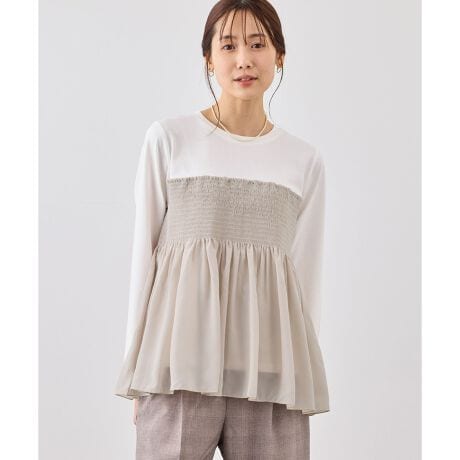 ・胸元のシャーリングデザインが目を引く、布帛ドッキングトップス。