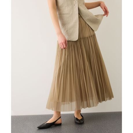 2段のティアードギャザープリーツが腰まわりを自然にカバーし、広がりすぎない上品なボリューム感でスタイルアップ効果も期待できます。動くたびに表情が生まれる、女性らしいシルエットが魅力です。