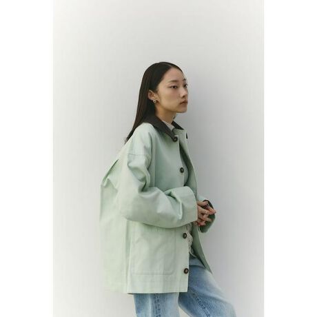 [型番:500JSB30-0141]モデル身長163cm(FREEサイズ着用)フェイクレザーの襟がアクセントになったカバーオール。ワークテイストなデザインに、異素材のコントラストを加えることで、程よく洗練された印象に仕上げました。さらっと羽織れる軽さで、季節の変わり目にも活躍。デニムやスラックス、スカートまで幅広く合わせやすく、カジュアルにもきれいめにも着こなせる一枚です。透け感なし、ストレッチなし。【お手入れ方法】ドライクリーニング