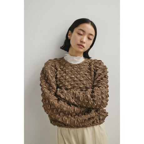 [型番:500JSB30-0561]モデル身長160cm(FREEサイズ着用)立体感のある素材が印象的なバルーンシルエットが特徴のデザイントップス。柔らかな素材感で着心地が良く、1枚で華やかな印象に導きます。シンプルなボトムと合わせるだけで、今年らしいバランスのスタイリングが完成します。透け感なし、ストレッチなし。【お手入れ方法】マシンウォッシュ可