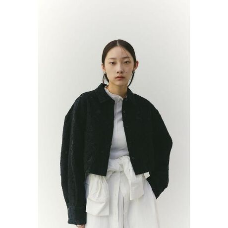 [型番:500JSA30-0601]モデル身長166cm(FREEサイズ着用)部分的に透け感のあるジャカード素材を使用した、春の訪れを感じるショートジャケット。シャツ感覚でさっと羽織れるデザインで、季節の変わり目にも取り入れやすい一枚です。ボディはワイドシルエット、スリーブもゆとりを持たせることで、抜け感のあるバランスに仕上げました。パッチポケットをアクセントに、カジュアルさとモード感を程よくミックスしたアイテムです。ストレッチなし、透け感あり。【お手入れ方法】手洗い可