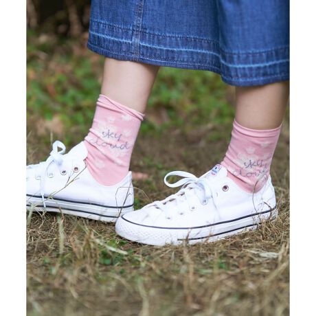 空に浮かぶ雲を花モチーフに「sky cloud」のロゴが可愛らしいショートソックス。