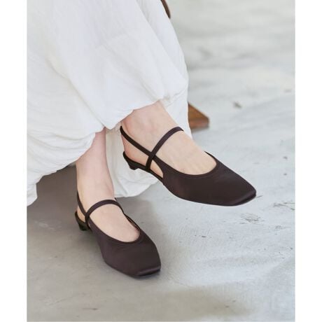 アンバランスなスクエアトゥーシェイプが魅力的なフラットのスリングバックシューズ。