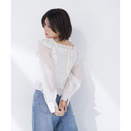 《限定店舗の発売日》相鉄ジョイナス店:3/中旬天王寺MIO店:3月中旬広島ミナモア店:3月中旬シアー感のあるチェック素材を使用したフェミニンな印象のトップス。細かく華奢なチェック柄が、繊細で上品な雰囲気を演出します。身頃のシャーリングデザインとコンパクトなシルエットで、着映えとスタイルアップが叶います。バックスタイルは華奢なリボン付きで、後ろ姿も印象的に見せてくれます。<素材>軽やかで透け感のあるチェック柄シアー素材です。柔らかくてしなやかな風合いで、フェミニンな表情が楽しめます。<詳細>仕様・開閉なし裏地・身頃はあり、袖はなし透け感・袖はややあり / 光沢・なし / 伸縮性・なし生地の厚さ・薄手※モデルの着用画像の場合、光の当たり具合により、実際の色味と異なって見えることがございます。色味は、商品単体の画像をご参照ください。