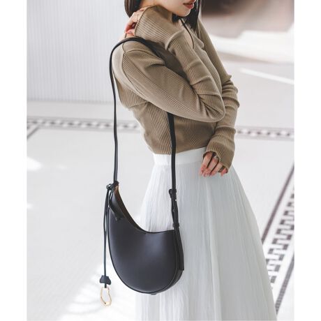 レザーのような風合いの合成皮革で使い勝手も抜群。印象的なシルエットも相まって持つだけでアクセントが生まれます。