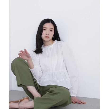 コットンローン素材で仕立てたペプラムブラウス。レースとピンタックのディテールが上品でレトロな雰囲気を演出します。フィットしすぎないペプラムシルエットで大人っぽく着こなせるデザイン。軽やかな素材感で、デイリーからキレイめまで幅広く活躍します。<素材>軽いコットンローンを使用しています。<詳細>仕様・後ろボタン裏地・なし透け感・ややあり / 光沢・なし / 伸縮性・なし生地の厚さ・普通※モデルの着用画像の場合、光の当たり具合により、実際の色味と異なって見えることがございます。色味は、商品単体の画像をご参照ください。