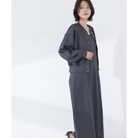 それぞれ単品でも着回せるカーディガンとワンピースのセットアイテムです。カーディガンは金属ハトメをあしらったドット釦がさりげないアクセント。同素材のノースリーブAラインワンピースは、体のラインを拾いにくく、縦ラインを意識したナローデザインです。デイリーからキレイめスタイルまで幅広く活躍してくれます。<素材>整った表面感と程よい厚みのある、しっかりとしたカットソー素材です。<詳細>仕様・カーディガンはドットボタン、ワンピースは開閉なし裏地・なし透け感・なし / 光沢・なし / 伸縮性・あり生地の厚さ・普通※モデルの着用画像の場合、光の当たり具合により、実際の色味と異なって見えることがございます。色味は、商品単体の画像をご参照ください。