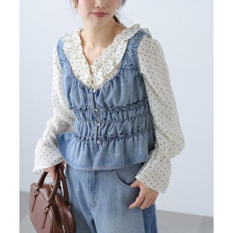 シャーリングを施し柔らかな印象に仕上げたデニムビスチェ。ステッチで甘さを抑え、メリハリのある表情をプラスしています。程よく開いたネックラインがデコルテをすっきりと見せ、抜け感のある印象に。バストまわりはフィットし、裾ペプラムがシルエットに立体感を演出。キャミソールやシアートップスとのレイヤードで、カジュアルながら女性らしい着こなしが楽しめます。配色パネルバレルワイドパンツ(ブランド品番131-6130206)とのセットアップもおすすめです。※モデルの着用画像の場合、光の当たり具合により、実際の色味と異なって見えることがございます。色味は、商品単体の画像をご参照ください。
