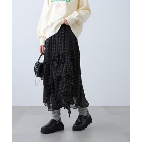 シアーな透け感素材に、ドット柄とバイアスチェック柄を揃えたアソート展開のイレヘムスカート。軽やかなシアー感がスタイリングに抜け感をプラスしてくれます。ティアード切り替えと、カスケードフリルやイレヘムデザインが、動くたびに表情のある印象に。ウエストはゴム仕様でリラックスした着心地もポイントです。カジュアルなスタイルにも取り入れやすく、ジャケット合わせもおススメです。※モデルの着用画像の場合、光の当たり具合により、実際の色味と異なって見えることがございます。色味は、商品単体の画像をご参照ください。