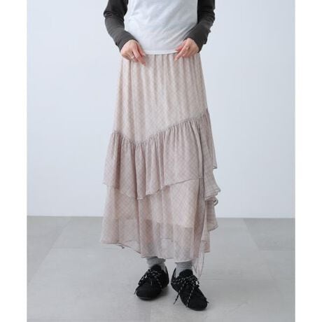 シアーな透け感素材に、ドット柄とバイアスチェック柄を揃えたアソート展開のイレヘムスカート。軽やかなシアー感がスタイリングに抜け感をプラスしてくれます。ティアード切り替えと、カスケードフリルやイレヘムデザインが、動くたびに表情のある印象に。ウエストはゴム仕様でリラックスした着心地もポイントです。カジュアルなスタイルにも取り入れやすく、ジャケット合わせもおススメです。※モデルの着用画像の場合、光の当たり具合により、実際の色味と異なって見えることがございます。色味は、商品単体の画像をご参照ください。
